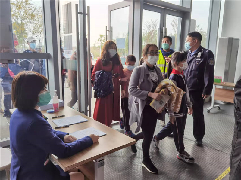 接种当日,路口处,保安负责学生家长车辆指引,确保车辆顺畅通行;体育馆入口处安排两名客服人员查验进场家长的双码是否为绿码、体温是否正常。进场后学生及家长根据规划路线及人员引导下进入羽毛球馆排队等候;方舱入口两名客服人员负责学生接种信息的登记;疫苗结束后,现场人员将羽毛球架重新推到原位并搭好球网,保洁阿姨负责清理地面卫生,确保可以恢复场馆正常营业工作。