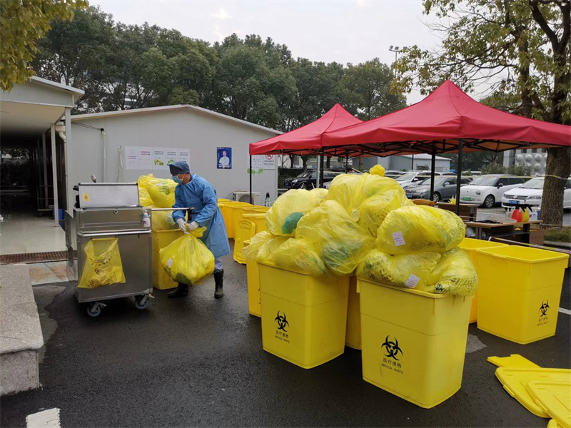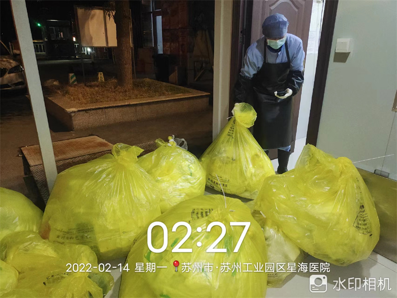 每天清晨5:00医废人员穿上防护服,戴上护目镜、口罩、手套等装备,全方位做好个人防护后,便开始了一天的工作。星海医院医废收集点承担了院外包括娄葑社区、金鸡湖社区,黄码点葑多个采样点送来的垃圾,及本院出去采样点的医疗废物打包好放置在临时堆放点。全部打包扫码完成后,他们还要将医疗废弃物堆放到处置点。几个月来,我们的物业医废保洁员和我们的保洁领班都会从当天早上工作至第二天凌晨。连续十几天都留宿在项目上,仅仅一张陪护床,睡了半个多月,从而保证医疗垃圾的及时清运和转运。