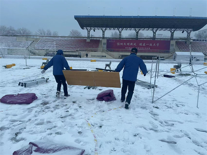三、疫情防控 学校封闭管理至今已月余,从漫天飞雪到桃花满园,天津分公司各项目积极配合校方开展各类防疫工作。期间参与核酸检测布场及现场保障工作累计60余次,每场核酸检测人数高达13500-38000人,即便项目人员短缺,仍坚持抽调人手前往核酸检测现场参与志愿服务,检测完成后对体育场区域进行还原、消杀。 四、员工关怀 齐心抗疫,爱不缺席。面对突然严峻的疫情防控形势,面临居家或是奔赴工作岗位的选择,我们可敬可爱的“东吴人”毅然决定收拾行囊,加入这场无声的“战疫”中。为保障员工在校封闭工作期间的生活起居,学校后勤保障部为大家准备了被褥,安排了临时住所,还免费为员工提供可口的饭菜,使大家倍感温暖。此外天津分公司还组织项目陆续开展慰问活动,为员工发放时令水果,补充维生素,保持营养均衡,身体健康。