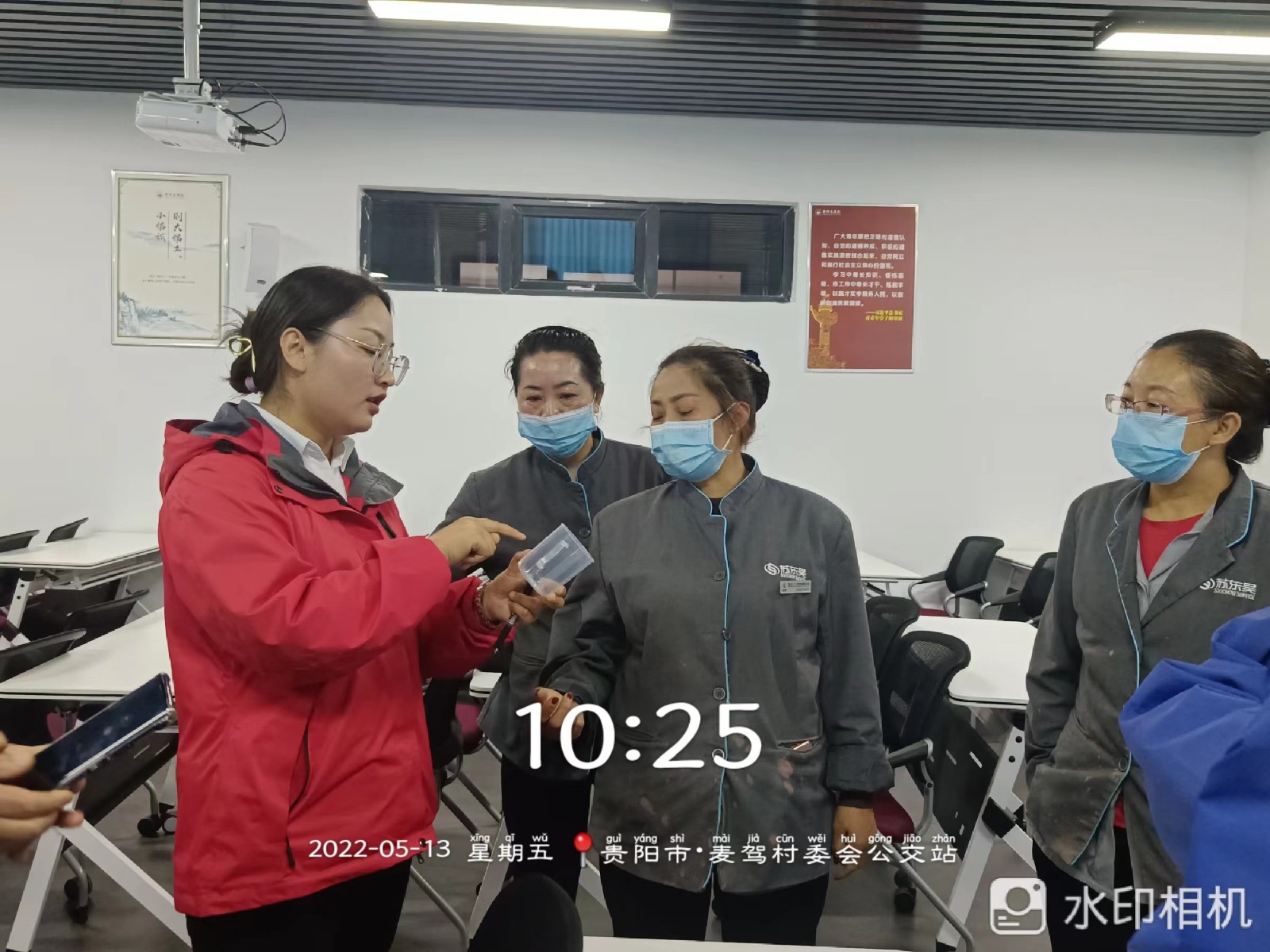 3. 84消毒液的兑比情况,经理蒋坤慧亲自用刻度杯为员工做示范。