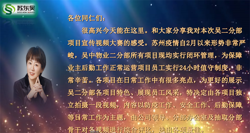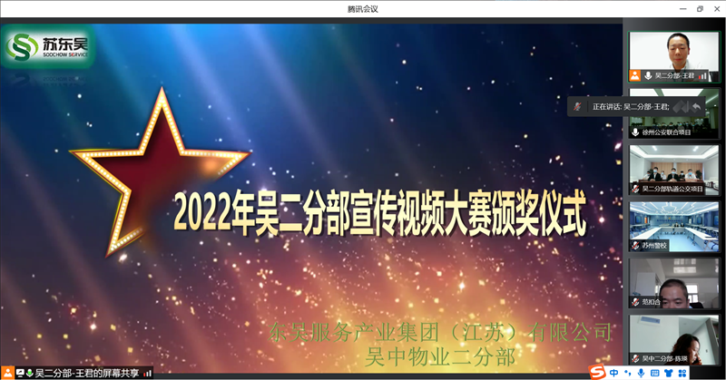 为更好的展示吴二分部各项目特色、展现员工风采,分部办公室决定开展“云视频、共抗疫”视频大赛。各项目独立拍摄一段小视频,内容以防疫工作、安全工作、后勤保障等日常工作为主题,最后由分部统一汇总评比出各项奖项。并于2022.05.17线上举行了“云颁奖”仪式,吴二分部所有项目均线上参加了活动。