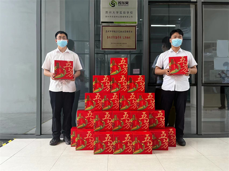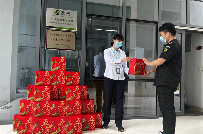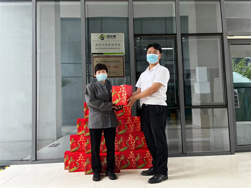 2022年5月27日,项目管理人员在物业办公室给员工们每人发放一大盒粽子。当大家收到时,都连声道谢,纷纷表示很感谢公司,内心真切地感受到了公司的关怀,更坚定了自己服务于公司的决心。他们纷纷表示要把公司给予的关怀化为动力,立足岗位,提高自身素质,为公司的发展贡献自己的力量。