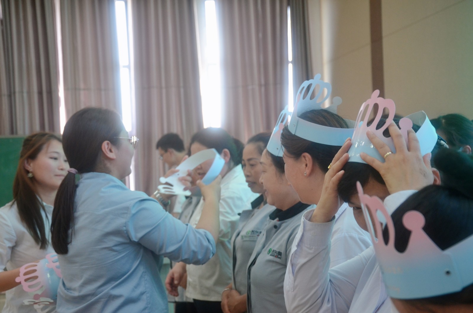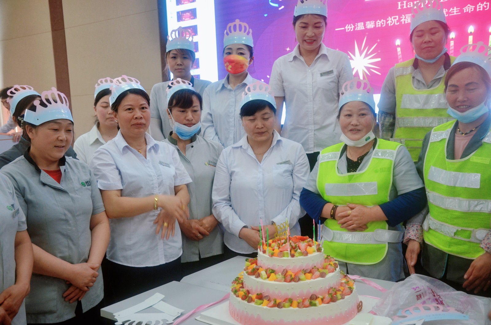 下午15:30生日会在幸福的歌声中生日会正式开始,项目经理蒋坤慧为寿星送上生日祝福并亲自为他们戴上皇冠,许愿结束后项目经理蒋坤慧又为员工切分蛋糕。