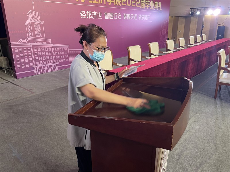 2022年6月14日,南开大学毕业季正式拉开帷幕。在6月14日-21日的8天内,东吴服务产业集团(江苏)有限公司天津分公司南开大学八里台校区项目先后完成了化学学院、经济学院、音乐厅主会场等多个毕业典礼举办场地和毕业生纪念品发放场地的布置工作;座椅搬运、舞台搭建、设备安装、卫生清洁、防疫消毒... 每一场活动成功举办的背后,都挥洒着物业人辛劳的汗水;每一滴洒落的汗水,都饱含着物业人对毕业学子深深的祝福。