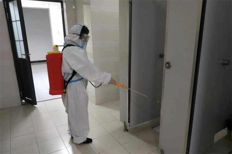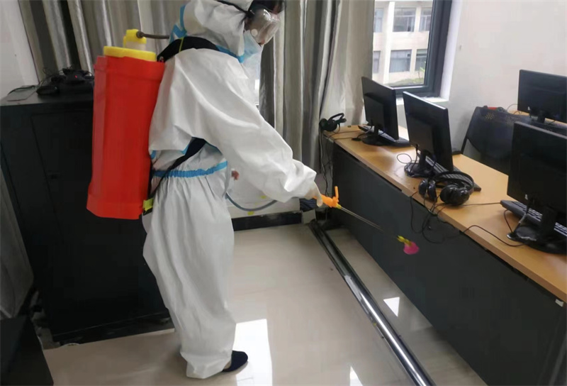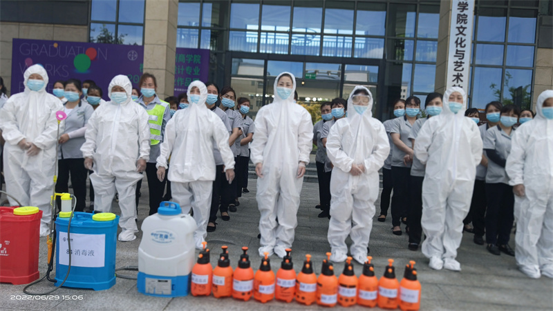 下午15:00,全体人员在尚智楼大厅集合进行疫情防控演练,项目经理培训结束后由各部门负责人带领保洁员进行教学楼的地毯式消毒。