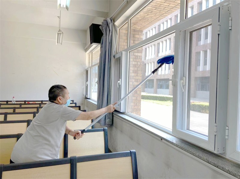 考试前安排保洁人员对各教学楼全面开展消毒消杀工作,清除卫生死角,增派保洁人员对每间考场教室进行清洁、消毒、通风,并张贴清洁、消毒、通风记录表;安排人员对考场进行布置,悬挂考点横幅,全力为考生营造良好考试环境。