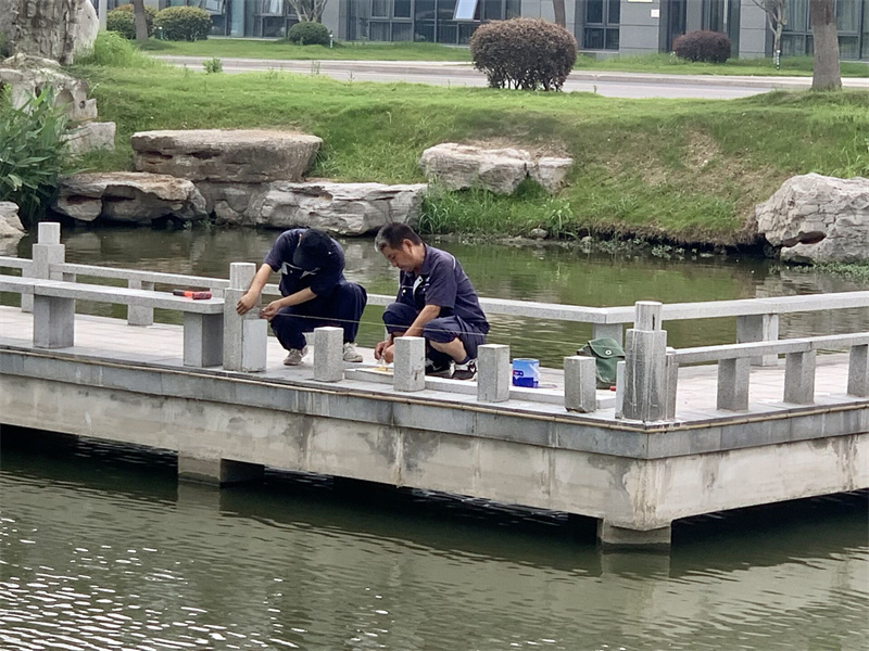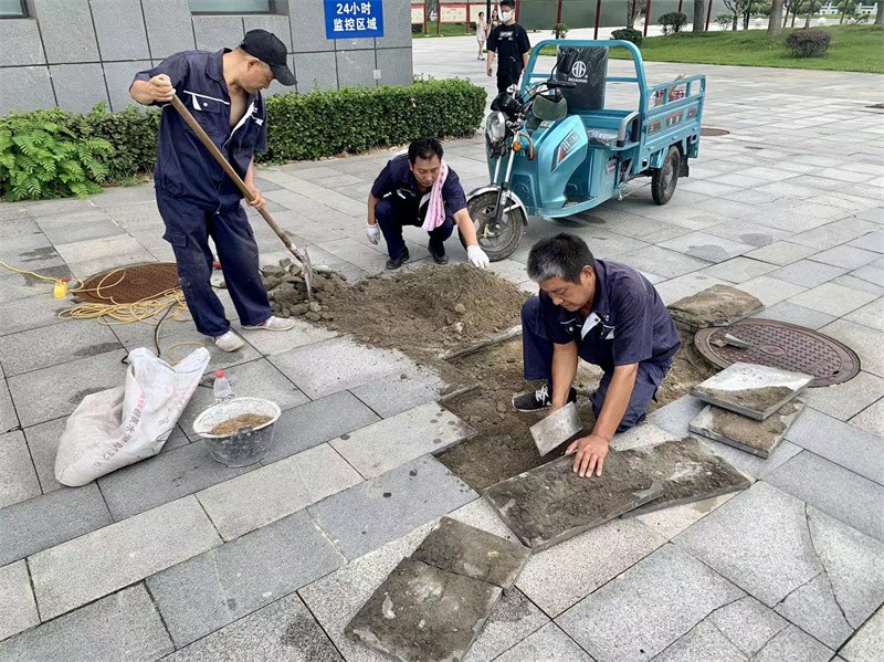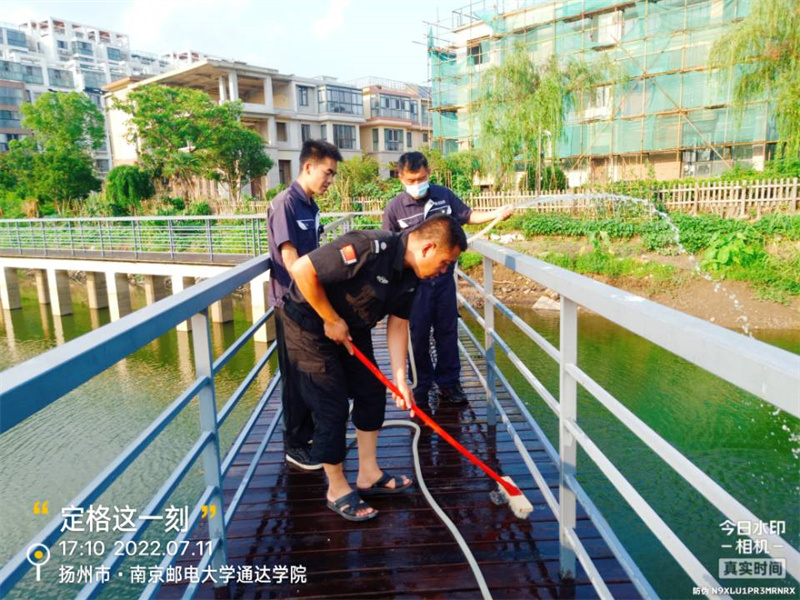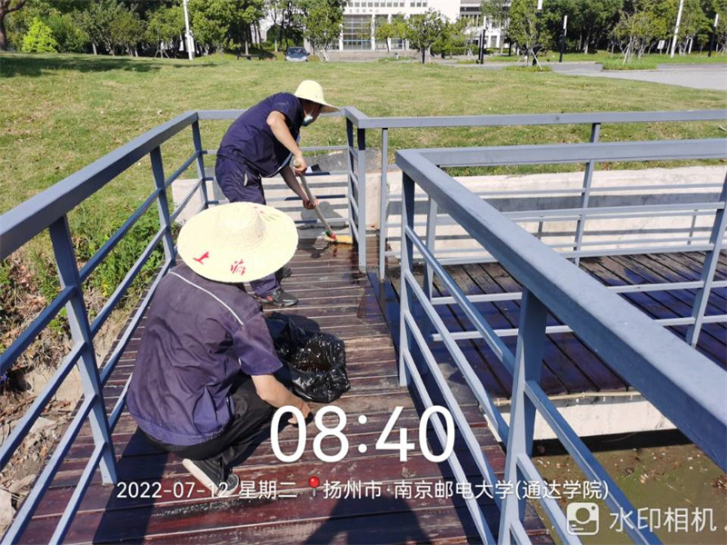 在校区配电房、泵房、地下室等密不透风的环境里,维修人员需要每天不间断的检查各种设施设备,是否存在安全隐患,用电线路是否正常等。不仅如此,他们每天还要巡查室外公共设施设备情况,及时修复受损设备。为了防止廊桥发霉腐烂,项目管理员组织保洁先将桥面污渍进行清洗,接着组织维修人员和保安刷桐油。40℃的高温下,为了不影响日常的工作,项目选择在午休时间进行清洗和刷油。即使在酷热的天气里,维修工作也绝对不能打折扣,他们的努力保证了各师生可以安全度夏。