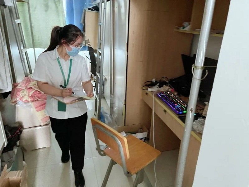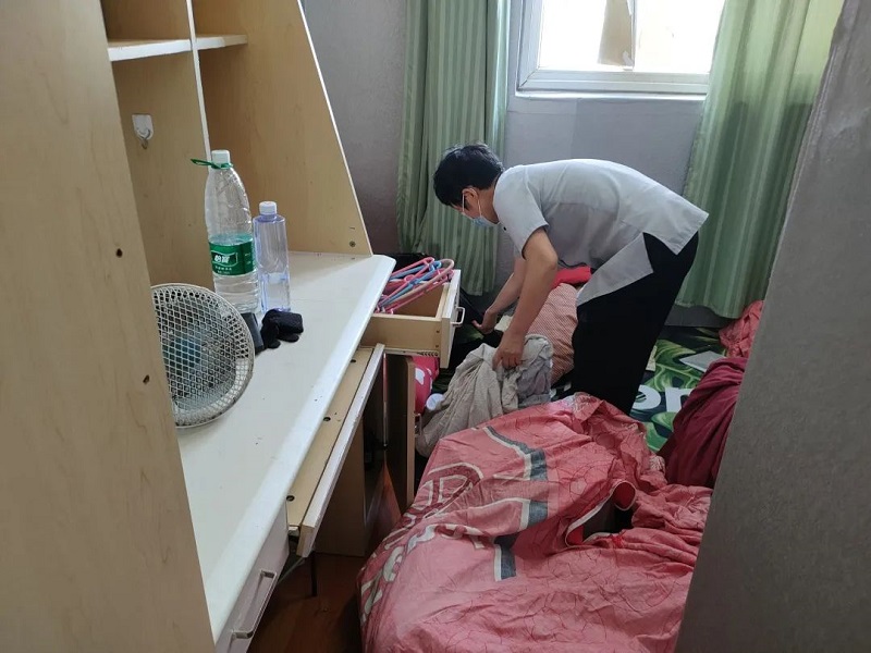 为确保暑期大装修的顺利开展,各校区宿舍项目安排管理员检查毕业生房间,对于遗留的贵重物品,及时联系同学,确保无误后再安排保洁员进行打扫。