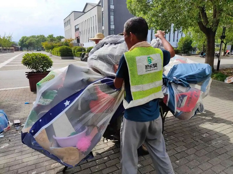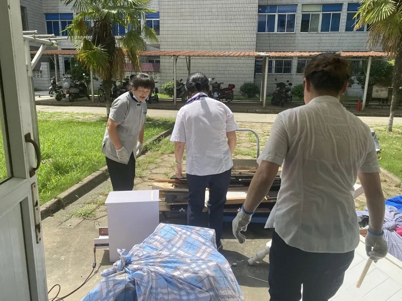 对于毕业生房间内的杂物,保洁员们仔细清理、搬运,之后再统一进行细保洁工作。炎炎夏日,汗水浸透了衣服,默默付出,只为新生顺利入住。