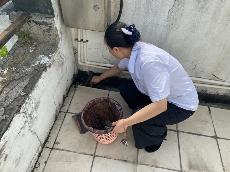 夏季多雨,为做好防汛工作,维修师傅和值班阿姨们,定期检查和疏通下水管道。