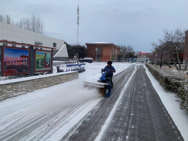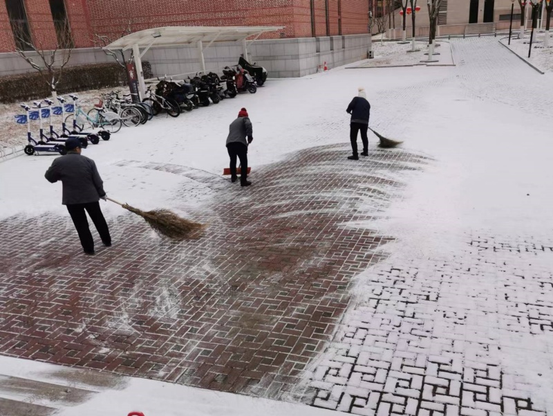 坚持“机械为主、人工为辅”原则,使用两辆清雪车对主干路进行疏通,同时各楼宇、公寓内保洁清理楼周边积雪,门口铺设防滑垫,为在校同学解决出行困难。清冰除雪暖人心,积极服务显担当。