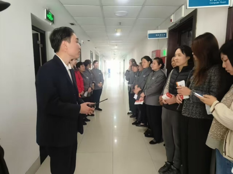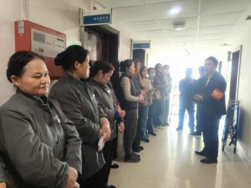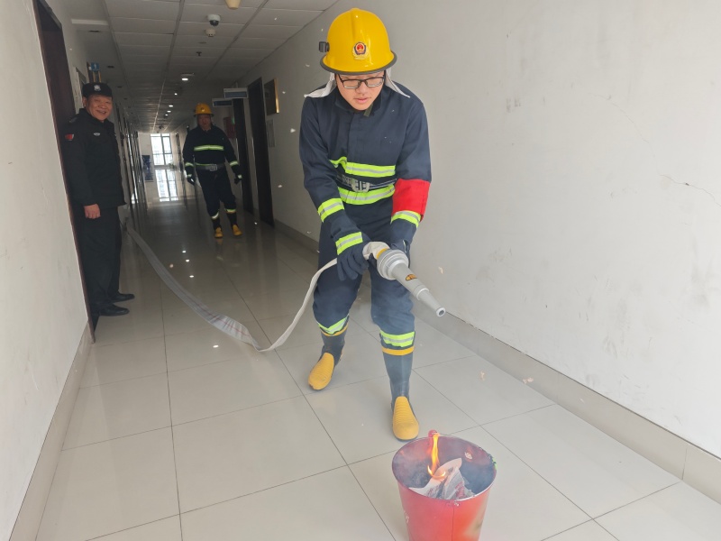 10:00,演练正式拉开序幕。现场模拟烟气触发楼层感烟探测器后,声光报警器同步启动,消防控制室第一时间接收报警信号。值班人员迅速锁定报警区域,立即调度巡逻保安携带通讯设备赶赴现场核查火情,同时启动应急救援预案,集结第二梯队救援力量,同步开展消火栓系统等支援工作。此时,火情模拟房间内烟气浓度持续升高,一名工作人员模拟被困且行动不便,灭火救援组迅速响应,采用担架转运方式高效处置,成功将被困人员安全转移至指定安全区域,整个救援过程紧张有序、衔接顺畅。