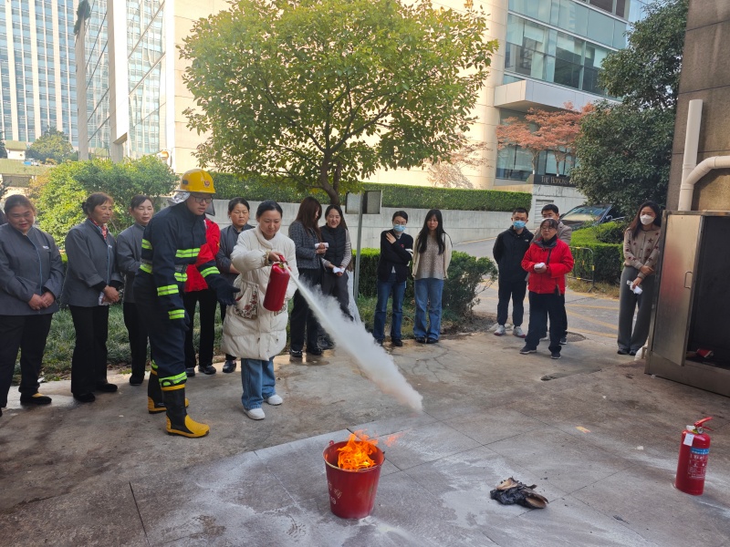 在楼外安全区域,项目负责人结合实操需求,现场讲解灭火器使用“四字要诀”:提手柄、拔保险、握喷管、压把手,强调需对准火源根部扫射,即可高效处置初期火灾。随后,灭火组点燃模拟火源,现场示范灭火器实操技巧,重点明确“上风向站位、对准火源根部、保持 3-5 米安全距离”等关键要点。