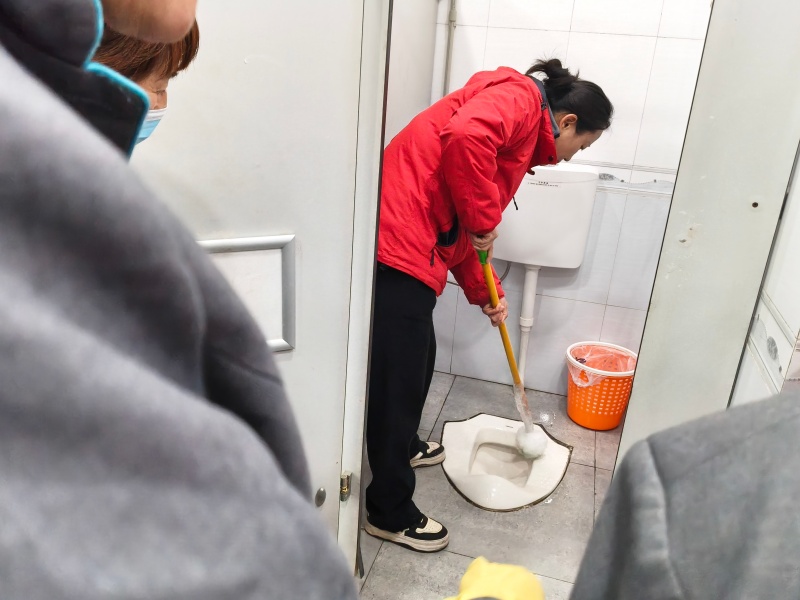 下午的实战教学直接把课堂搬到了楼道、电梯、卫生间等工作一线。从玻璃擦拭 “无水痕” 的核心秘诀,到电梯不锈钢的精细化保养细节;从卫生间龙头、蹲坑的深度清洁技巧,到不同材质、不同污渍对应的药剂选择与工具搭配…… 专家团成员手把手耐心指导,将每一个操作动作细致分解,确保大家学懂弄通。