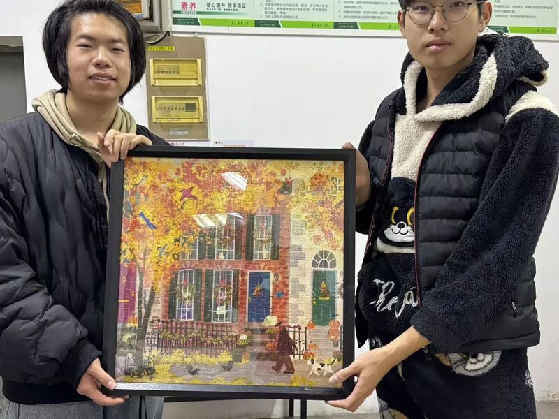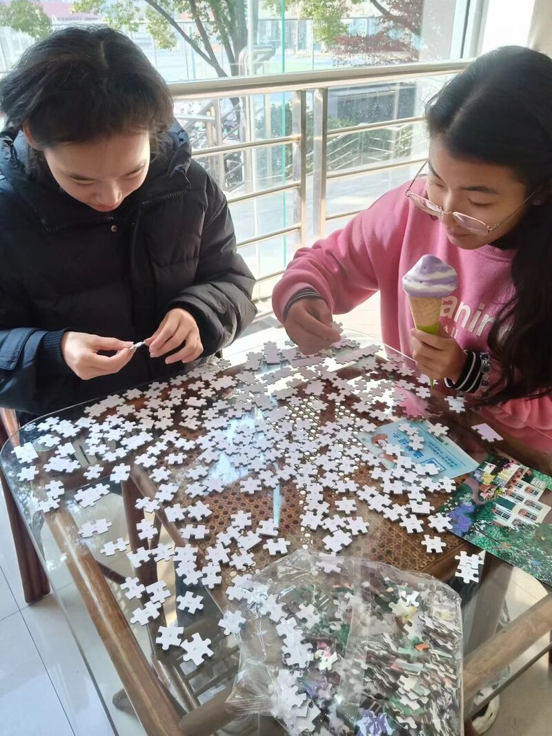 活动区的拼图板前,一组四人宿舍围得水泄不通:有人跪坐在地,手指飞快扒拉着散落的拼图块,嘴里嘟囔着“这块是宿舍的窗户吧?”;有人踮着脚凑近参考图,眯着眼比对边角的图案;还有人举着一块拼图,猛地往板上一扣,大喊“对上了!”,话音刚落,同伴们立刻发出一阵欢呼,连旁边组的同学都忍不住回头看过来。