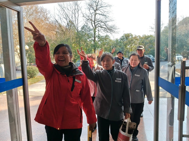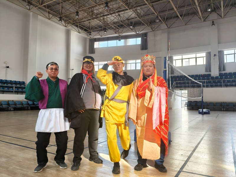 才艺表演过后,创意节目轮番登场,欢乐氛围再升级。项目部4位男主管化身“东吴西游男团”惊艳亮相:“孙悟空”挥起扫帚当金箍棒,“猪八戒”扛起拖把扭起俏皮舞步,诙谐幽默的演绎精准戳中笑点,让阿姨们笑到直抹眼泪,全场欢乐值瞬间拉满。