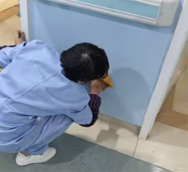 在门诊楼高层连廊,保洁员蹲在地上,用小铲一点一点剥离,耗时近一小时才将地面彻底还原。在住院部电梯间,保洁员同样耐心细致地清理着覆盖在健康教育宣传栏边角的不干胶广告,不让一丝污损影响整体环境。