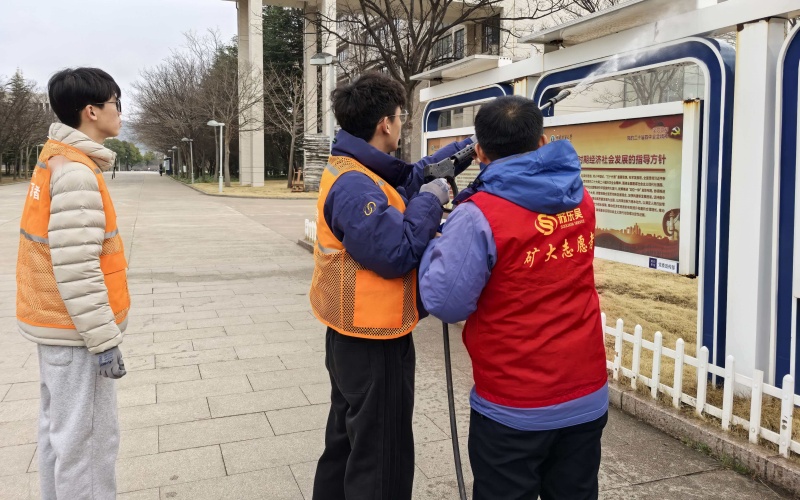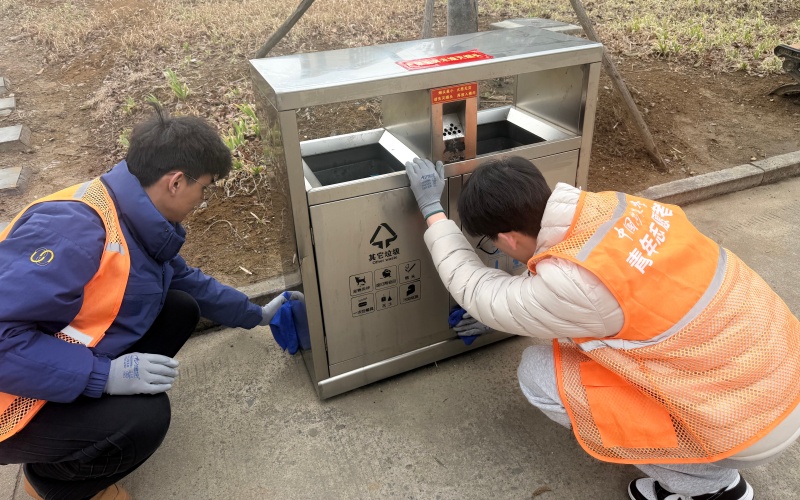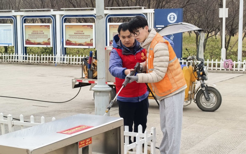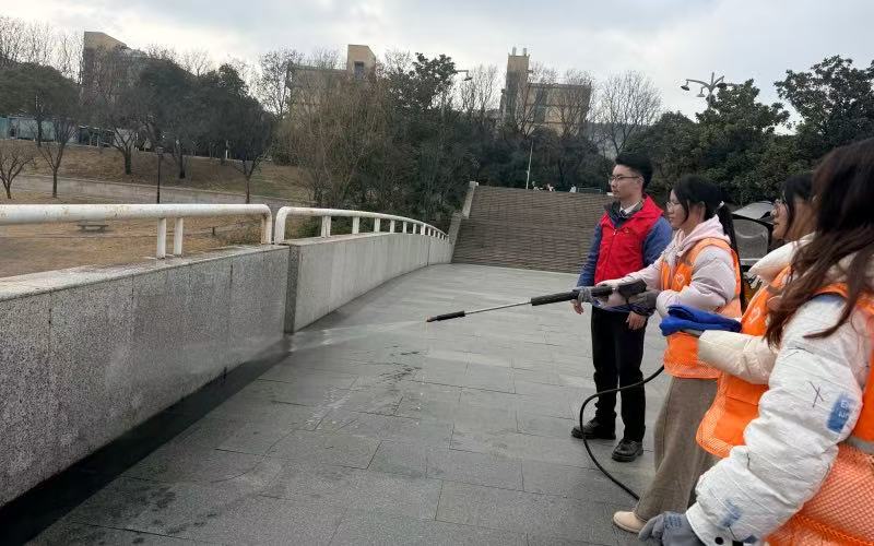 本次活动聚焦校园环境整治提升,涵盖烟头清捡和公共设施冲洗等实践环节。全体人员分组协作、干劲十足,身着志愿马甲的身影成为校园中一道靓丽的风景线。