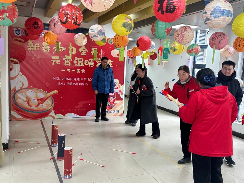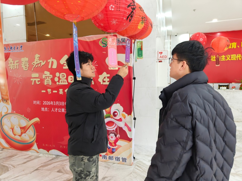 2026年3月3日上午,“新春马力全开,元宵温暖常在”元宵节主题活动在南京邮电大学仙林校区、三牌楼校区、浦口办学点同步启幕。活动现场张灯结彩,红彤彤的灯笼与五彩斑斓的灯谜条相映成趣,投壶、套圈体验区布置妥当,处处洋溢着热闹喜庆的节日氛围,学生、辅导员老师与宿管阿姨齐聚一堂,共同解锁元宵欢乐时光。