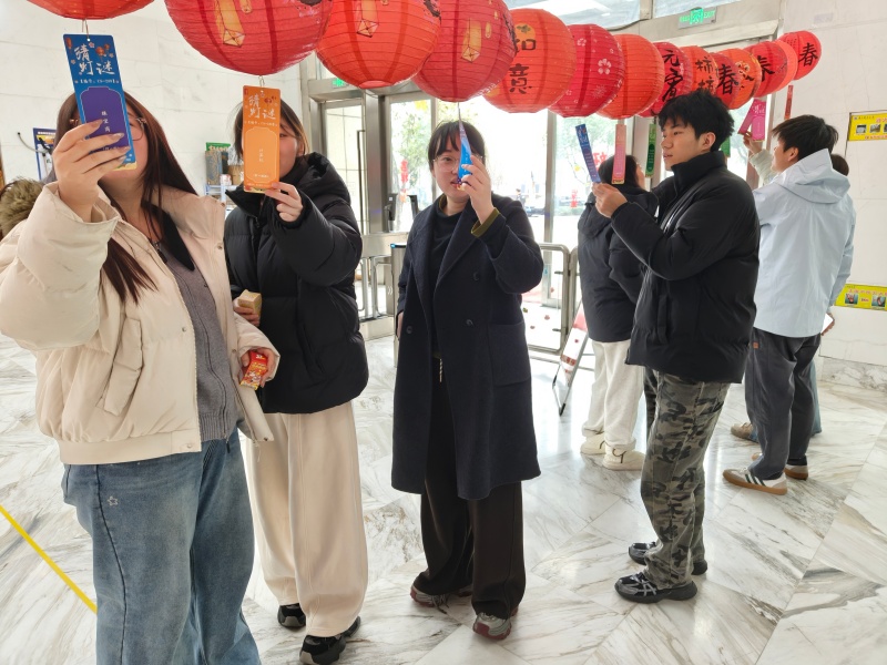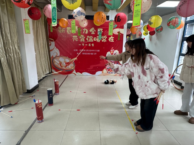 猜灯谜区里,学子与宿管阿姨并肩思索、携手解谜,阿姨们还不时分享元宵民俗趣闻,欢声笑语萦绕四周;投壶赛场中,同学们屏气凝神、精准投掷,辅导员老师亲自上阵助阵,宿管阿姨们在旁呐喊加油,现场气氛热烈高涨;套圈区域内更是暖意融融,大家彼此谦让、互相支招,每一次套中奖品的欢呼,都让节日的喜悦加倍传递。
