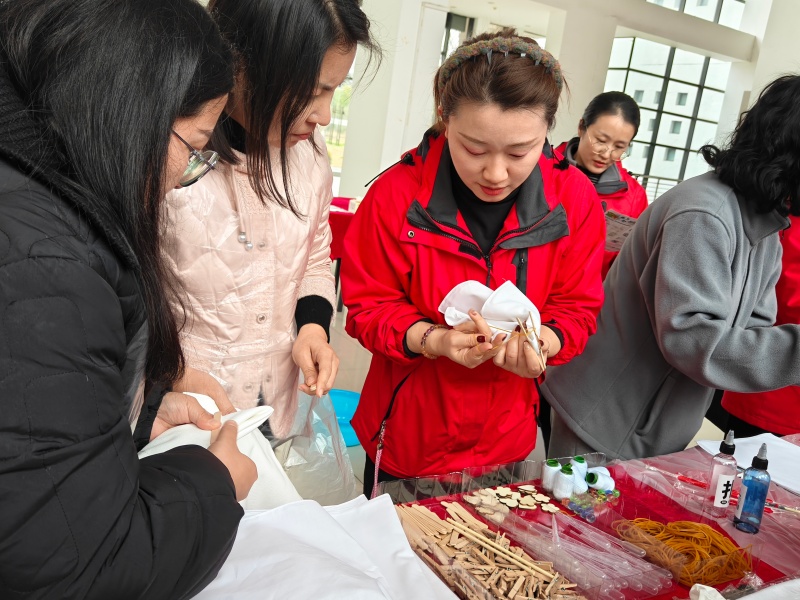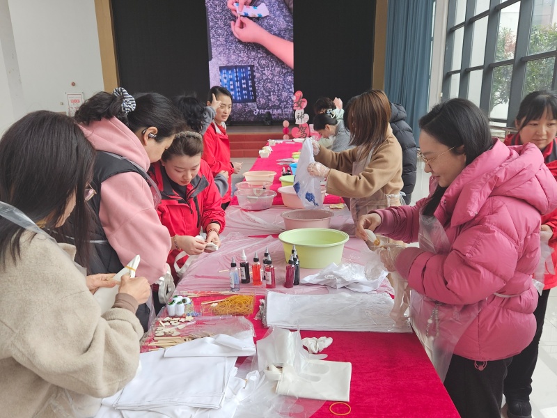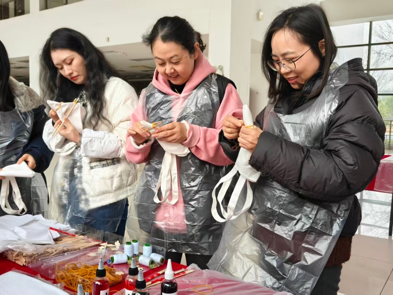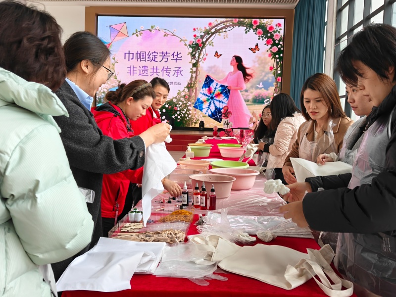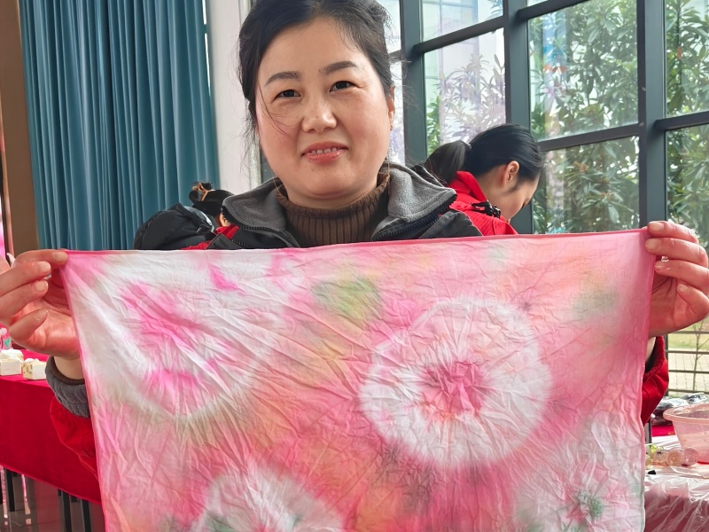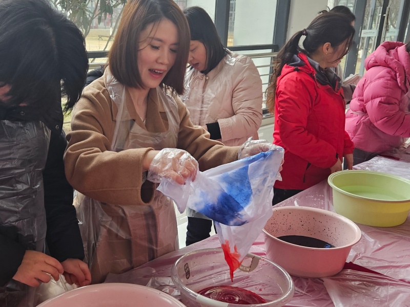 动手体验环节,瞬间点燃了现场所有人的热情。女教师、女学生们与项目工作人员齐聚一堂,循着指导将纯白的布料巧妙折叠、细致捆扎、牢固固定,再小心翼翼地浸入染料中,静静等待独属于自己的花纹慢慢晕染成型。创作过程中,大家围在一起相互探讨技巧、分享创意想法,欢声笑语在现场不断回荡,陌生的距离在指尖的互动中悄然消融,彼此间的情谊在交流协作中愈发浓厚。