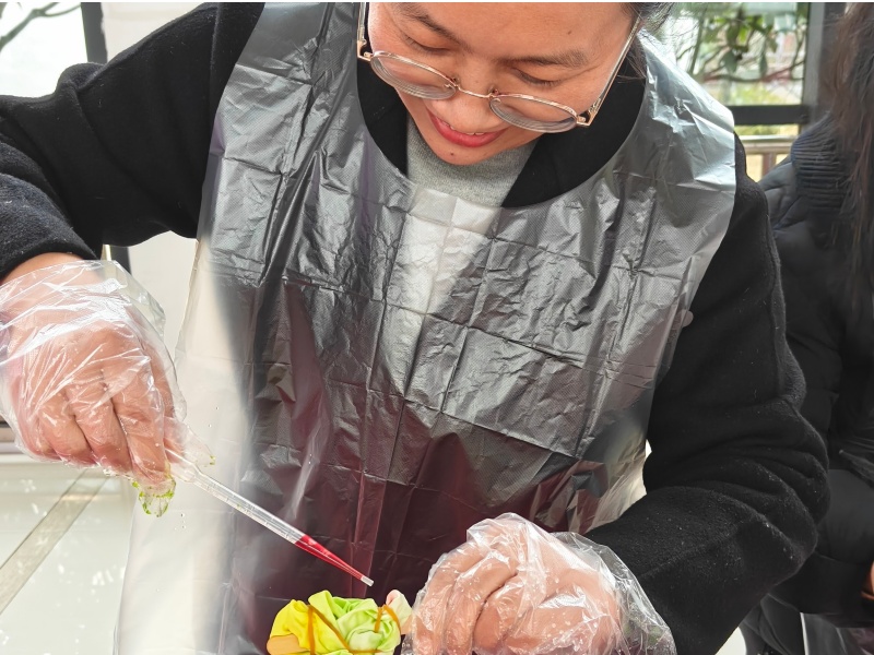 活动现场,工作人员通过扎染科普视频与现场讲解相结合的方式,从扎染千年的历史源流讲到夹染、捆染、折染的经典技法,将每一种技法的操作要点娓娓道来。现场生动细致的步骤演示,让在场者沉浸式感受传统工艺蕴含的独特匠心与文化魅力。为保障创作体验,项目工作人员提前筹备就绪,备好布料、染料、皮筋、夹子等全套工具,精心布置出温馨舒适的创作空间,让师生们能够安心开启手工创作之旅。