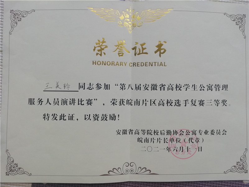 项目管理员王美玲获得皖南片高校公寓演讲比赛三...