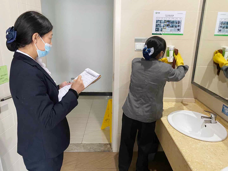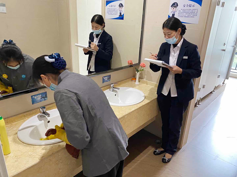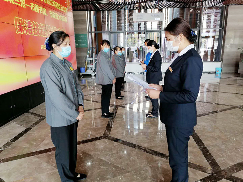 本次实操比赛项目包括:仪容仪表、地面推尘、玻璃刮洗、电梯轿厢打扫保养及卫生间清洁五个项目,理论比赛包括:应知应急知识问答、疫情防控相关知识,全方面地考察项目保洁员在日常工作中的速度、质量专业知识及以问答的形式提问疫情防控相关知识,最后由项目负责人及条线负责人作为评委对考核内容进行综合评分。在项目主管的组织下,图书馆保洁条线和市委市政府大院条线负责人对本次比赛非常重视,层层选拔出15名优秀保洁员前来参加比赛。