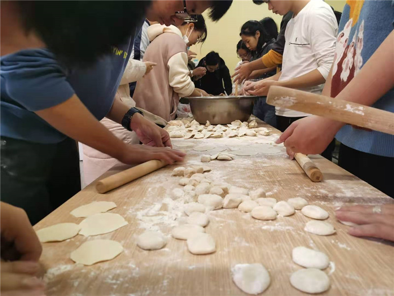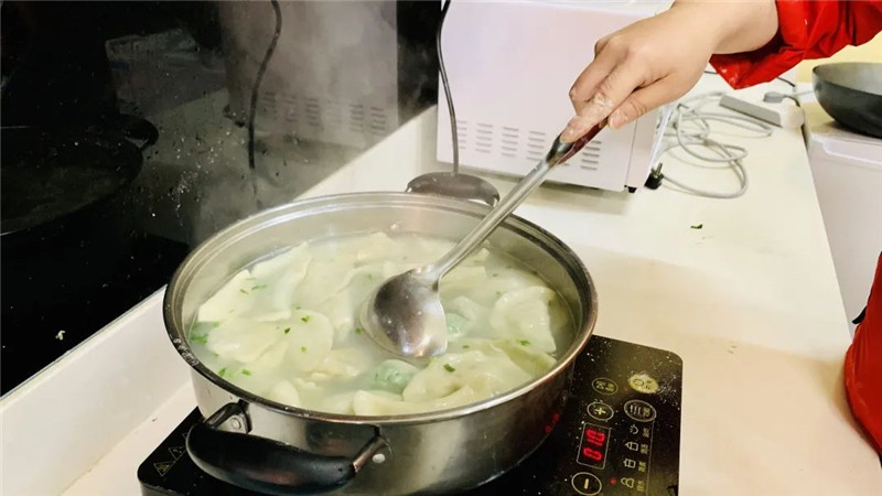 包完饺子,传统的包饺子步骤自然是要下饺子——传统下饺子讲究火候,得沸腾三次才能捞上来,由于我们只有两个锅,煮饺子赶不上趟,每次煮饺子同学们都望着锅“求而不得”。