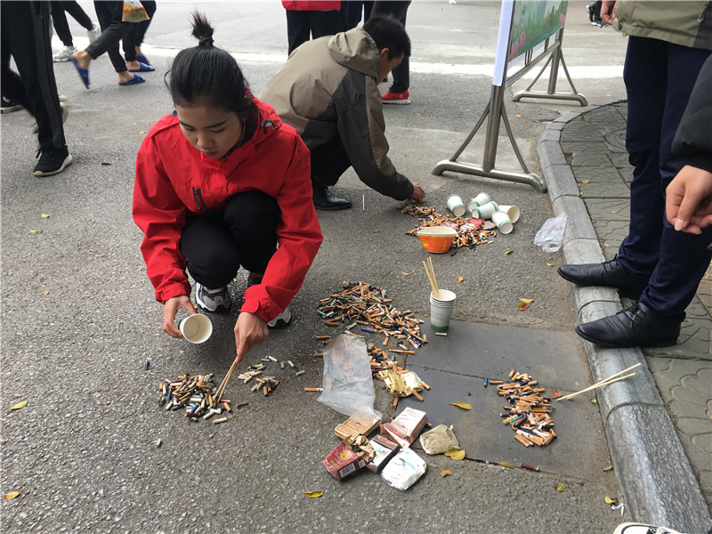 同学们认真寻找藏在校园里的烟头。短短30分钟,收获颇丰,在校园路面、尿槽等地方捡到烟头1195个。