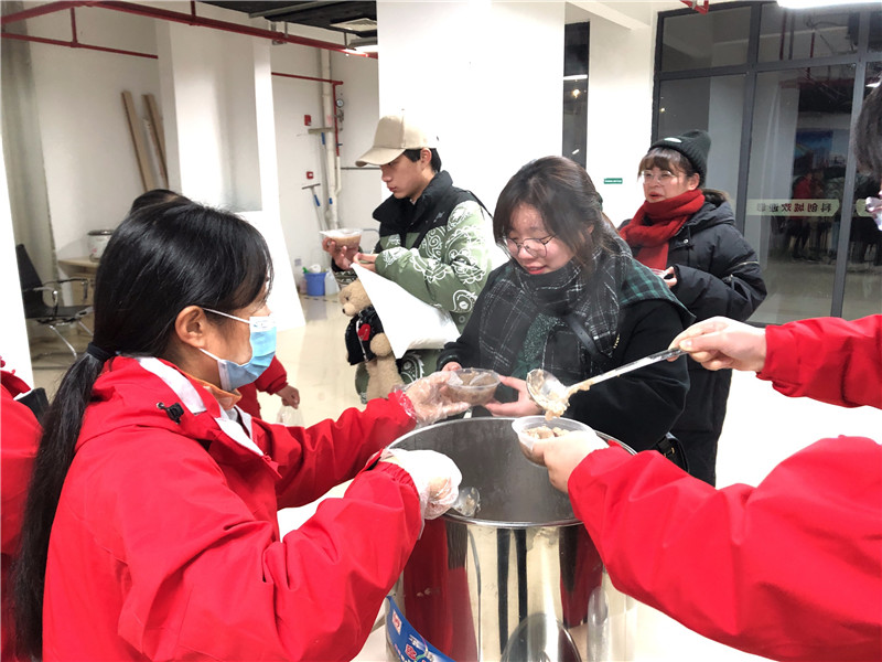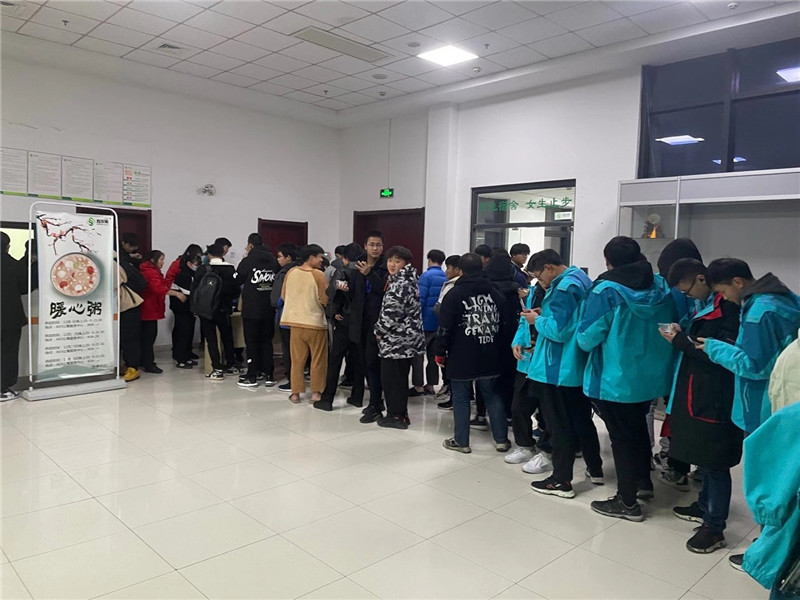 活动前期开始准备食材、各种工具并与各院校沟通确定时间,宿管阿姨们也从家里带来大锅,有的还自己又添了一些食材放到粥里。活动当晚学生们早早地就排起了长队,有的学生吃完了却久久不愿离开还想再来一碗。看着学生们久久不愿离去的身影并一边吃一边夸赞着好吃的样子,负责煮粥的阿姨脸上乐开了花。