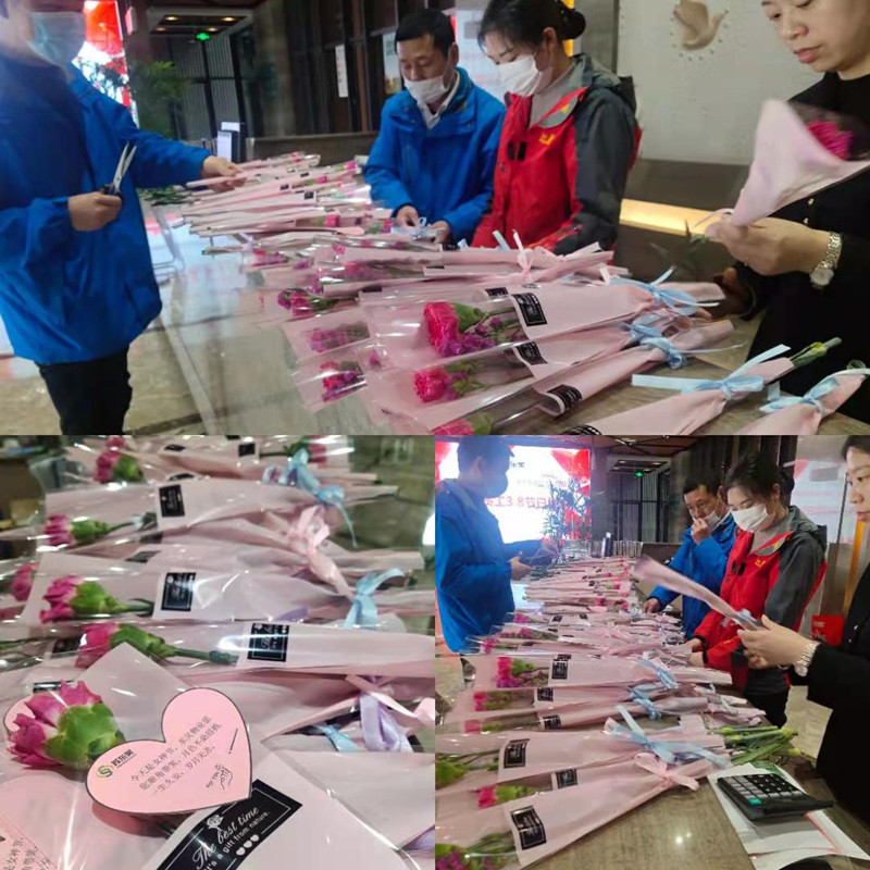 康乃馨花语是热情、魅力,它集爱与美于一身,既是美神的化身,又溶进了热情的血液。而在节日的早晨收到物业工作人员送来的玫瑰花,美丽的女性同志们深深的感受到物业对她们节日的祝福。