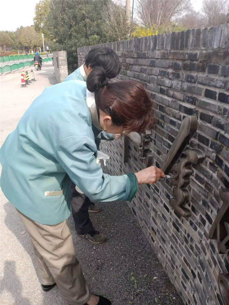 保洁上,外场杂草清理、青砖青苔刷洗、展厅玻璃手印清洁、展台擦拭系列工作有条不紊展开。