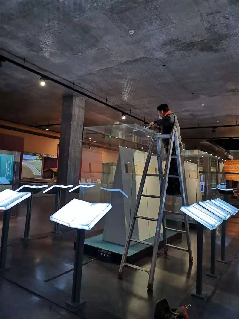 维修上,姐妹窑里重新布线,更换防爆灯;维修也有个名字叫万能工,登高趴地,必要的时候也干起保洁,由于展厅玻璃罩较高,顶部的保洁全部由维修来完成。