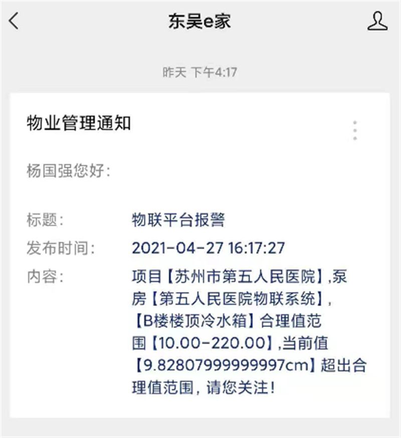 2021年4月27日16时,苏州市第五人民医院项目部受到一条物联平台报警信息,系统显示楼顶水箱低水位报警。项目部立即启动应急预案,员工首先前往楼顶水箱处确认水位;随后前往生活水泵房检查压力表,确认控制回路有无问题;同时,检查楼顶浮球。在排查以上几项均没有异常后,最后在热交换间发现是控制系统保险丝熔断,导致了报警信息。一线员工更换保险丝,恢复控制系统运行,排除了故障。