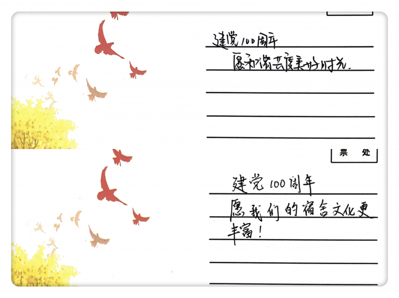 2021年是中国共产党建党100周年,一百年来先人们饱经沧桑,换来我们几十年的平安享乐。为庆祝党成立100周年,我们增加了明信片活动,同学们可以通过填写明信片的方式诉说对党的热爱、诉说校园情。