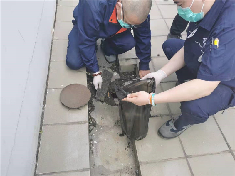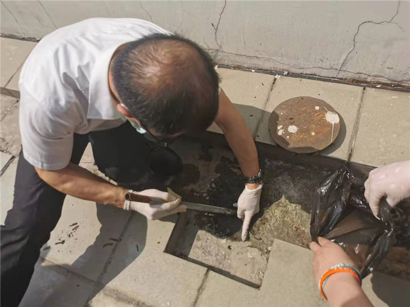 项目组员工首先检查顶层的设备房,查验各电柜门锁是否正常关闭。此后,重点对排水沟开展清扫工作,清理垃圾、拔除杂草,保障排水功能不受影响;对于部分排水口出出现的淤泥结块的现象,杨国强经理以身作则,在烈日下使用工具一点一点凿碎并清理泥块,确保每一个排水口都能正常运作。下午16时,项目组召开例会,督促夜间值班人员加大巡查力度,防患于未然。