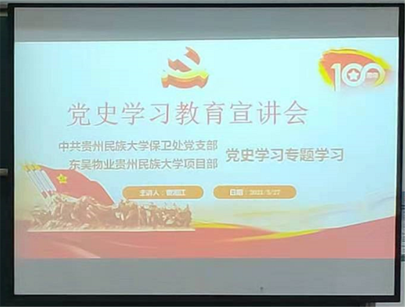 为深入开展党史学习教育,做到学史明理、学史增信、学史崇德、学史力行。2021年5月27日早上10点,东吴物业贵州民族大学花溪校区项目部特邀贵州民族大学保卫处党支部曹湘江副处长为我们讲解党史,参会人员有保卫处处长欧阳宁康、副处长杨昌春及其他领导等,以及东吴物业公司贵州民族大学花溪校区项目部全体员工。