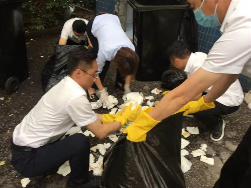 翻尽了近60大袋垃圾后,很遗憾并未找到,此时大家把最后的希望寄托于国交布草间,经过第二轮翻找,还是没有找到。这时,顾老师说:“失主已放弃,物业同志们非常热情,也很辛苦,但是已经尽力了,虽然没有找到,但依旧感谢你们的帮助”。可是管理人员不约而同卯上了劲,大家都不想放弃,纷纷提出,再去垃圾厢房进行第三轮翻找。