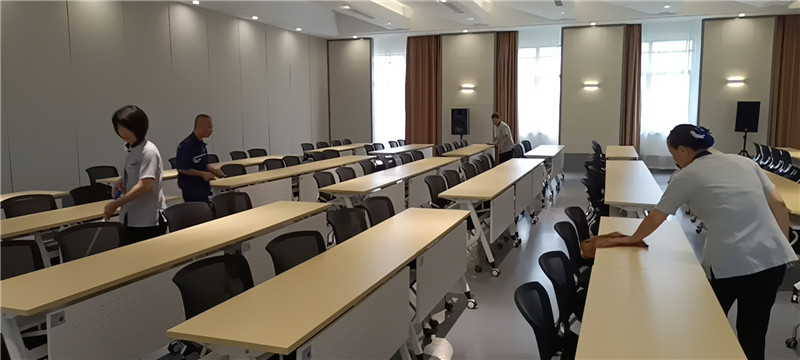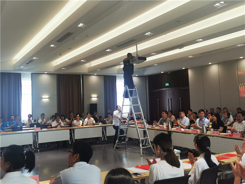 为保障此次活动的顺利开展,城三农业科学院项目部对会场布置,音频调试,人员分工等做了周密地安排。 2021年7月16日活动当天上午,项目经理带领全员开始会场布置,保洁组负责会场的卫生;保安组负责桌椅的定位摆放;工程组负责音响设备的调试及投影仪的转向,舞台线路的走向定位;客服组负责评委席的茶水准备及室内空调开启。一切准备就绪,下午一点三十分活动正式开始,项目经理王亮还担负着音乐播放任务,保障会场音乐的调试播放。