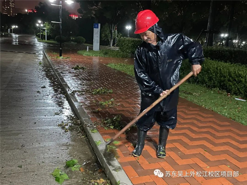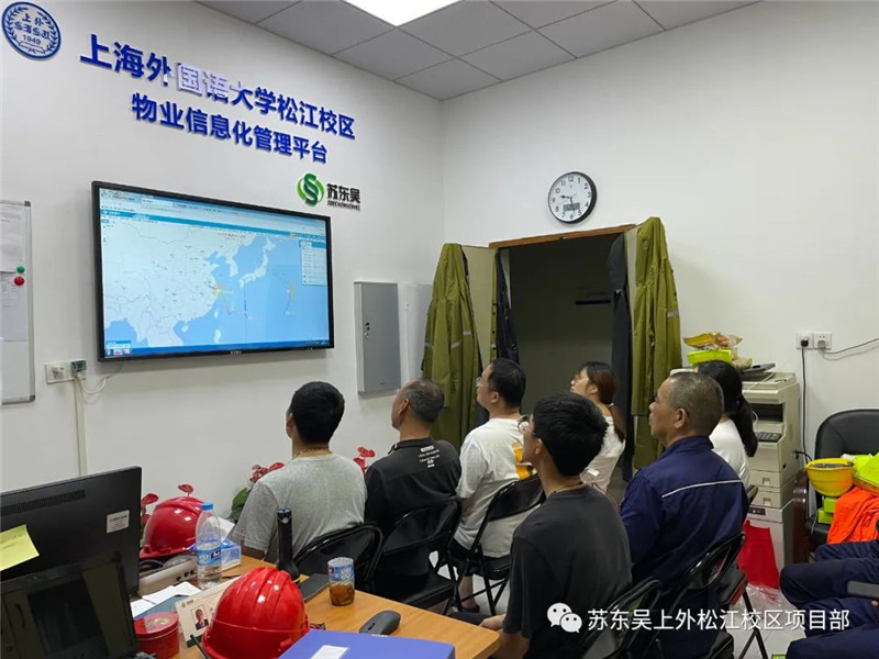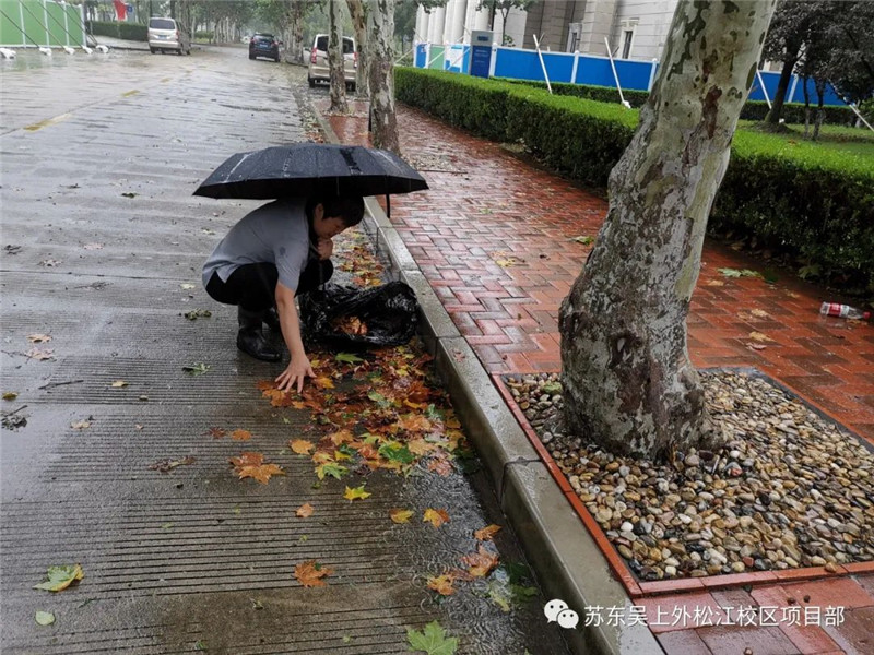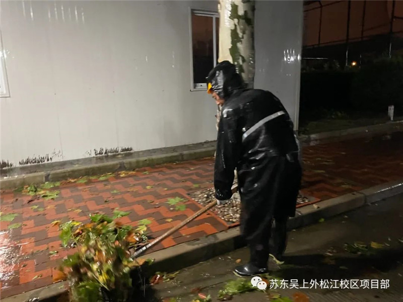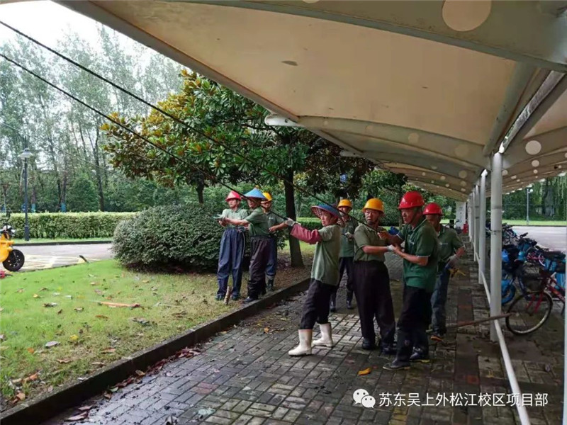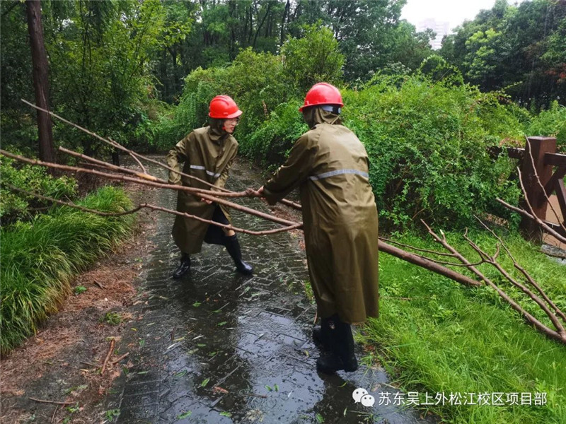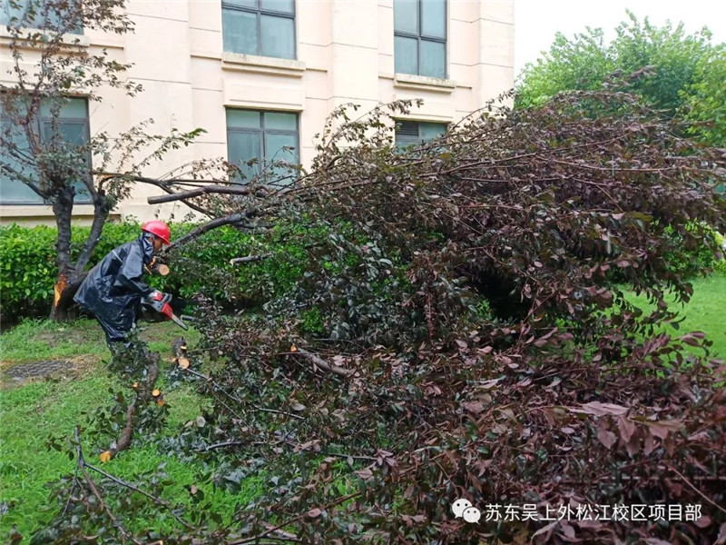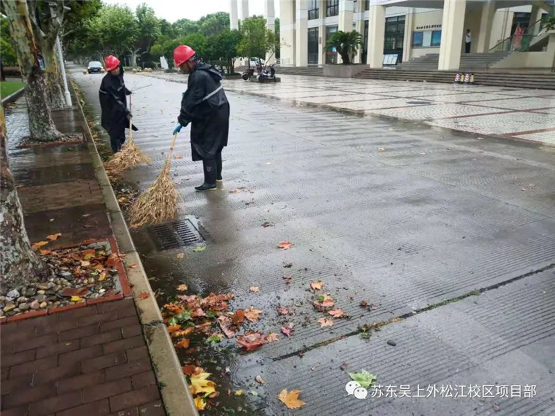 根据后勤管理处下发的《关于做好第6号台风“烟花”防御工作的通知》要求,项目部及时部署,安排24小时值班人员,密切关注台风“烟花”行动轨迹,对室外绿植、楼宇门窗、楼顶平台、电路设施设备、学校常积水区域进行重点排查,确保无人员生命财产安全,最大限度减少灾害损失。