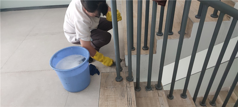 按照分工安排,保洁部工作人员使用专业的设备和洗消清洁剂,充分利用各种工具和试剂,先粗加工后细加工,对墙面,地面及玻璃上的污渍及装修残留垃圾进行清理,各项工作有序进行。她们细心进行着每一个环节,动作标准规范,力求营造出无污渍、光亮洁净的生活空间。