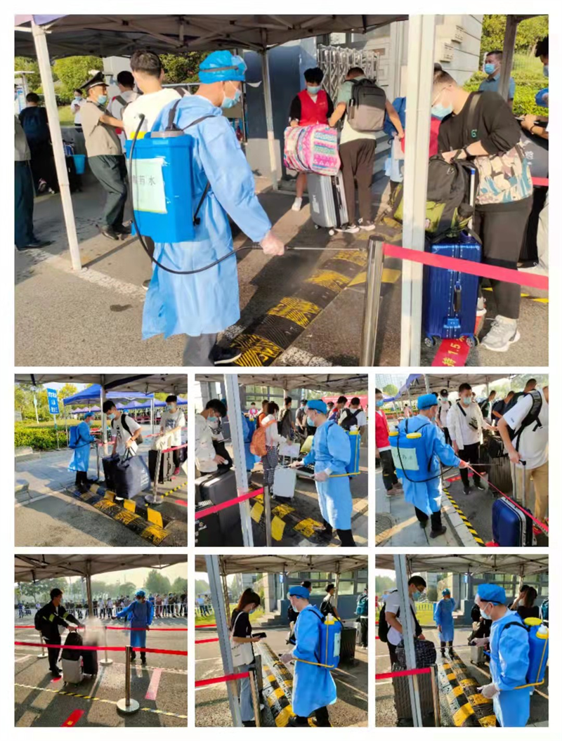 白天、晚间各安排两名消毒人员在门岗执行消杀工作,新生入校门时排队进行全身及物品消毒,保障安全。确保疫情防控阶段迎新工作的顺利开展。