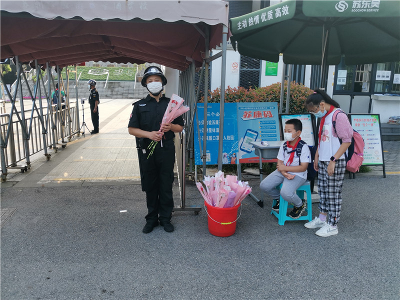 向在学校护岗的交通辅警送上鲜花,感谢他对学生风雨无阻的守护!