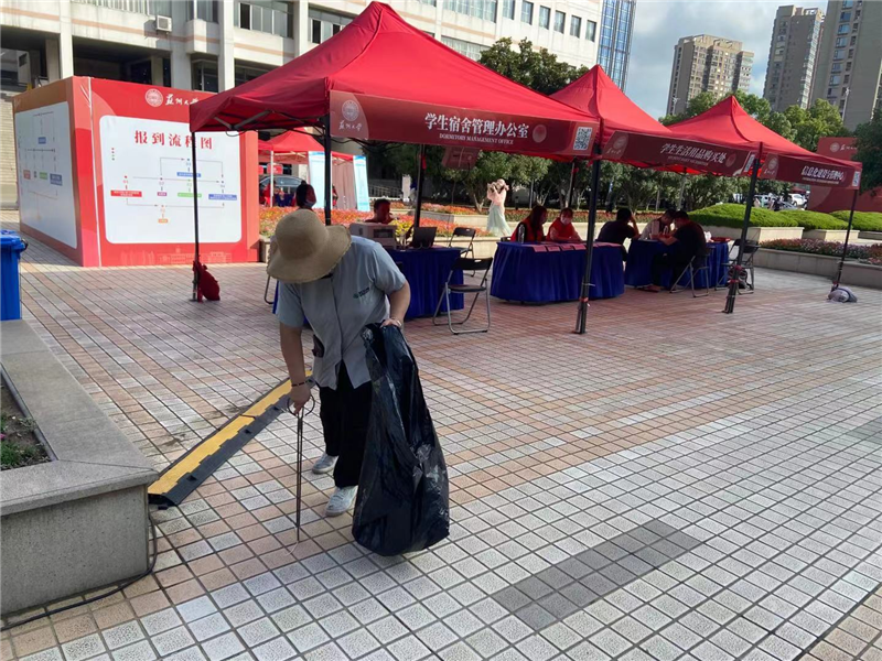 校园内还随处可见我们保洁阿姨的身影,对迎新点以及主干道等人流量大的区域进行循环保洁,保证校园内环境的整洁,让新生们感受到苏大校园的美丽风景。