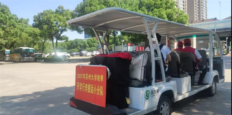 在迎新期间,苏大后勤处、东吴物业宿舍项目部为新生提供“最后一公里”接驳行李服务。东区 2 辆,本部 1 辆,独一 1 辆,独二 1 辆,阳澄湖 1 辆。