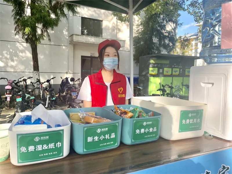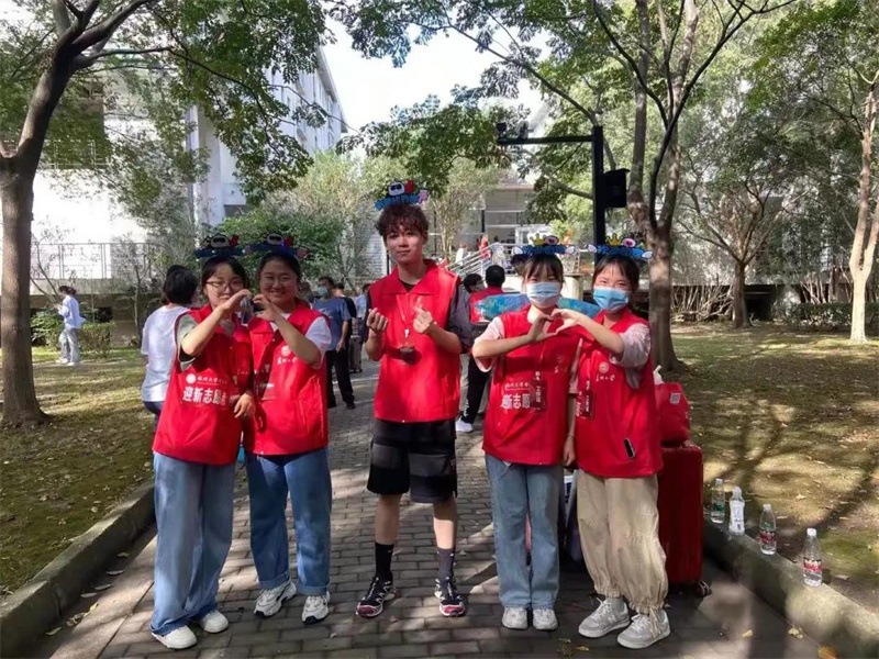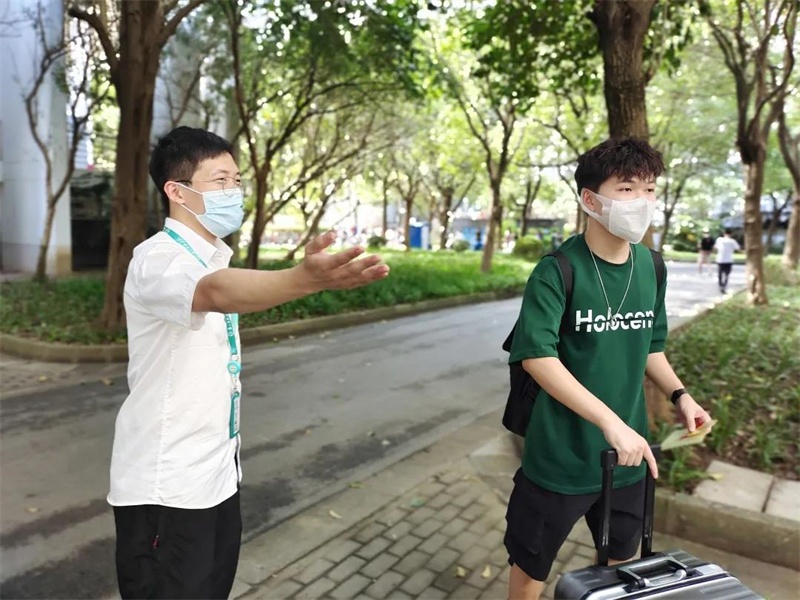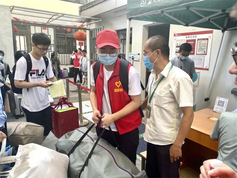青年志愿者们干劲十足,为携带大件行李的同学们提供帮助,为“小萌新”们提供指引路、答疑解惑等服务。