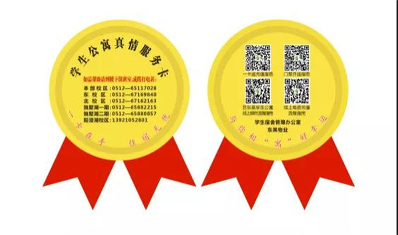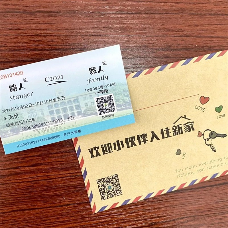 为了使新生更好的融入校园,迎新当天各校区制作了一系列的迎新海报。例如:新生入住须知、新生入住流程、宿舍入住宝典、新生安全提示海报、防疫海报、垃圾分类宣传易拉宝、横幅等。除此之外,在报道当天真情服务卡也会发到学生手中,学生可通过该卡片进行线上保修、线上电费充值、门禁开通、一卡通充值等服务。卡片上还配有物业办公室电话,无论何时,都能第一时间为学生提供最大的帮助。天赐庄校区本部也为学生提供了特殊定制版的“高铁票”从陌生人转变为家人,车票背面配有宿舍用电详情须知,使同学们更好的了解并避免使用违规电器。而我们的地标采用气球的图案,意味扬帆起航。天赐庄校区在原有地标的基上涂上染料,夜间也能为学生提供引路导航。