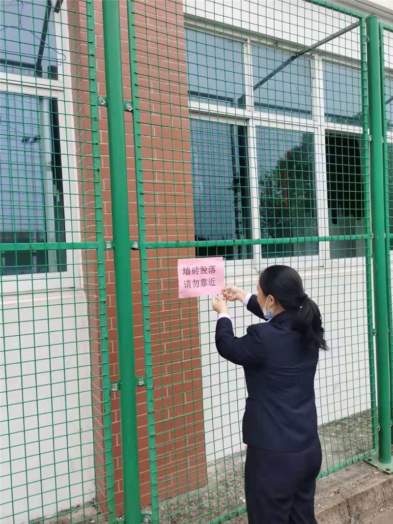 校内室外环境则由管理员杨晓天带领人员负责巡视,减少室外垃圾亭放置的垃圾桶.,查看墙体是否有脱落现象、路边绿化有无倒塌风险、室外排水沟有无沉陷和拉裂现象。