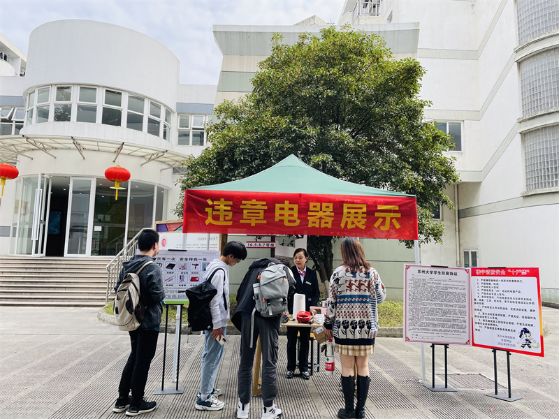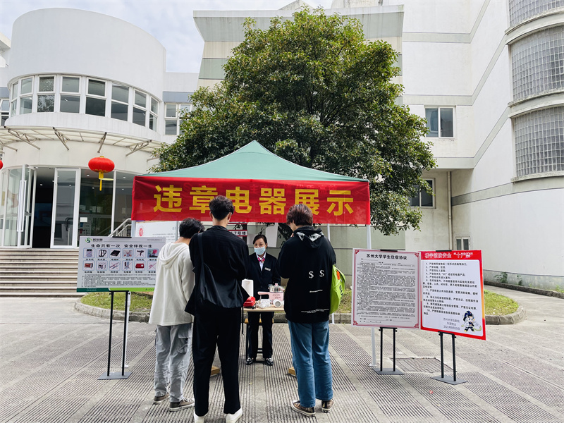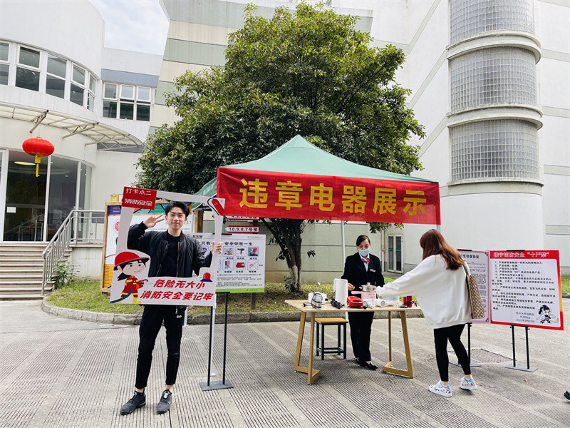 10月28日,在宿舍院内主干道摆放违章电器相关宣传展架,主要展示哪些是违章电器,宣传使用违章电器可能造成的严重后果。